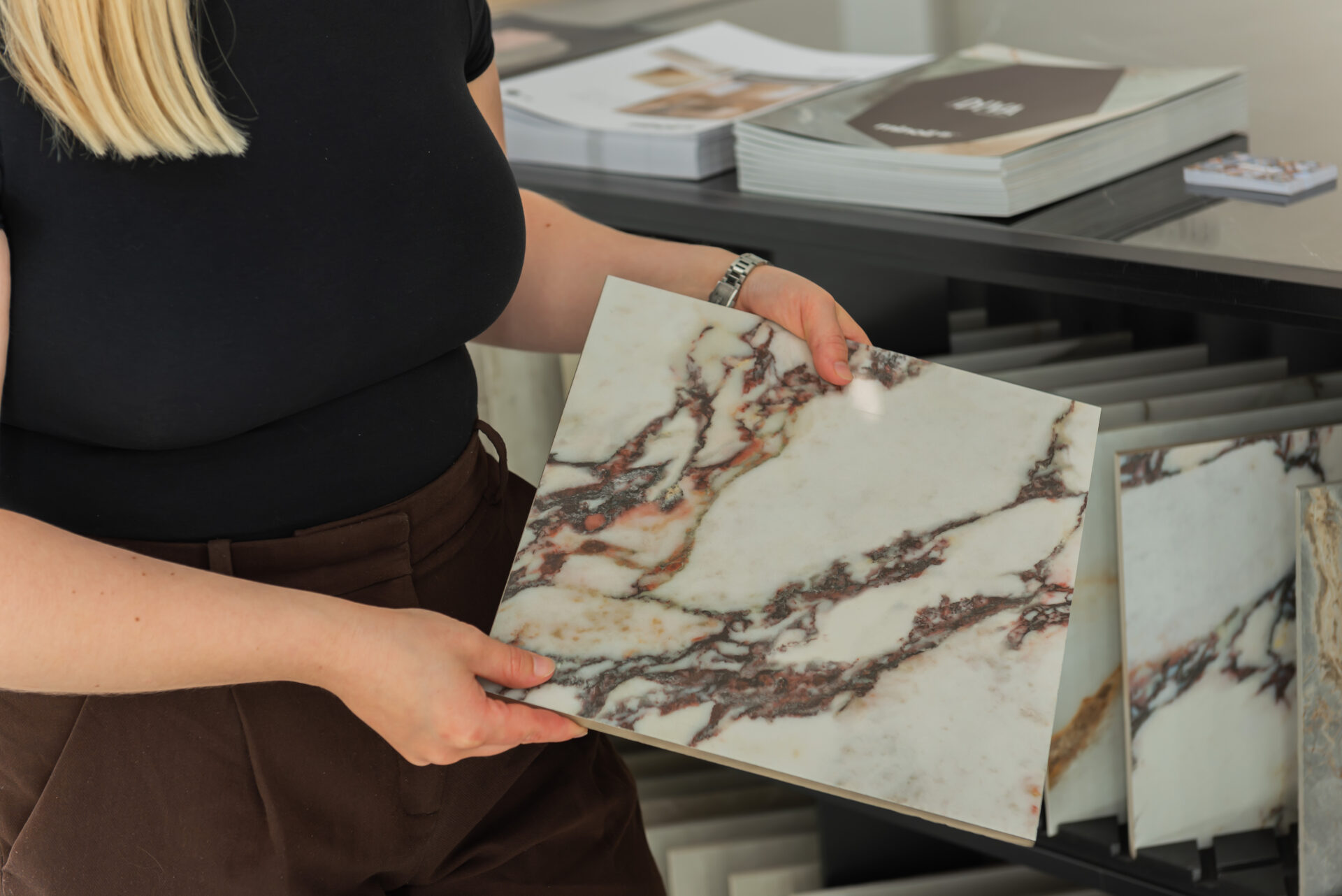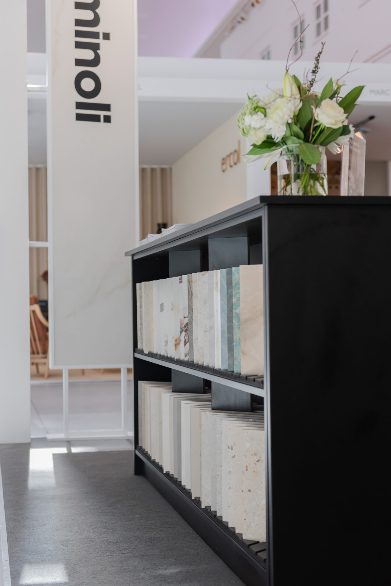 We also showcased the brilliant book match design of Marvel Calacatta Prestigio in the full-size 120/278 format. Plus, visitors explored our sustainably produced ranges with over 60% recycled content and new collections of colourful small format and brick tiles, which were all very well received at our pop-up showroom stand.