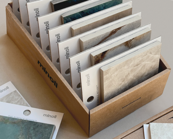 Getting hold of samples from Minoli’s porcelain and ceramic tile collections is simple and the marketing team at Minoli aim to maintain stocks of all our current ranges, usually provided as 10 x 10 cm preprepared cut pieces, mounted on labelled card.
