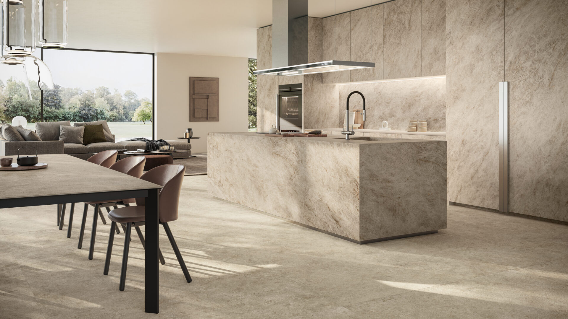 Alpin encapsulates the strength and beauty of the natural world in all its nuances. Drawing inspiration from the famous Brazilian granite, its surface evokes the majesty of the mountains. With burnt caramel-coloured crystals, delicately dotted with dark veins and contrasting beige tones, this design creates an exquisite and exclusive, textural effect.