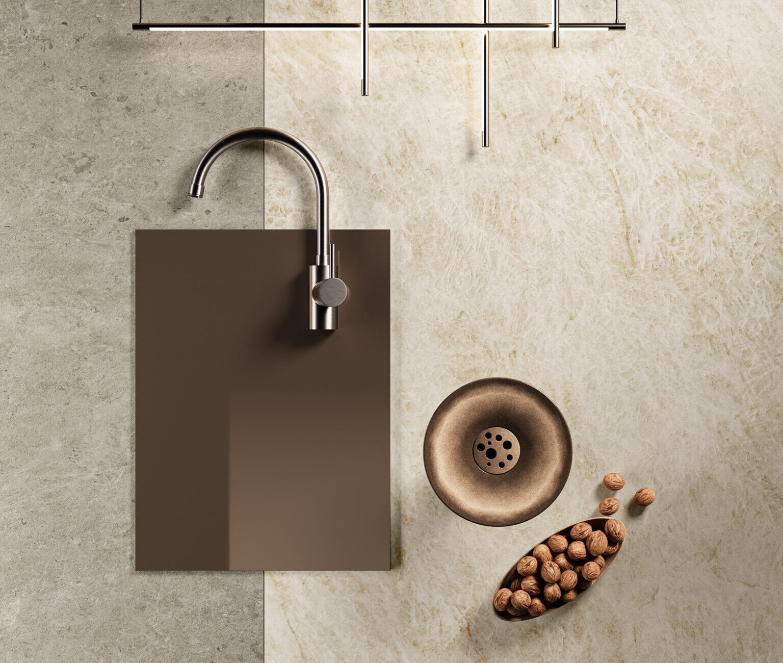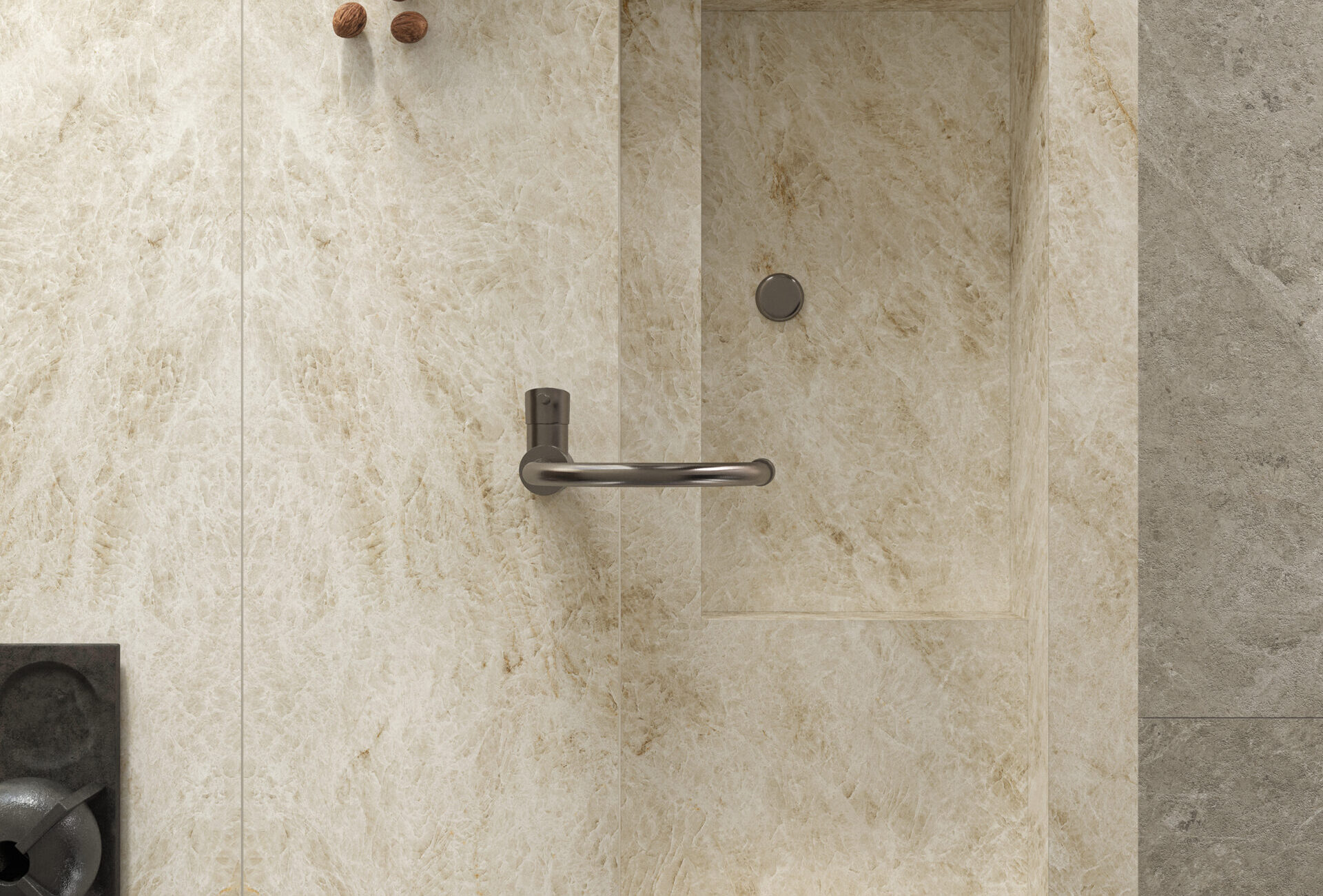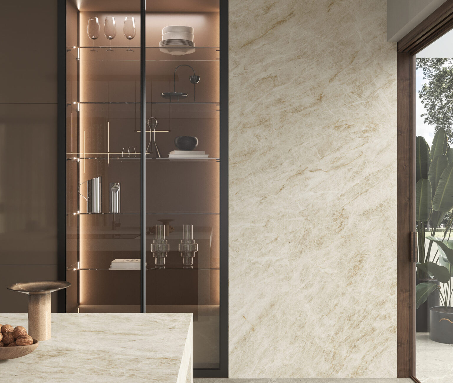 Inspired by the timeless appearance of the Taj Mahal marble, this surface stands out for its enchanting, mottled background, crossed by pale taupe patches and delicate cream veins.
