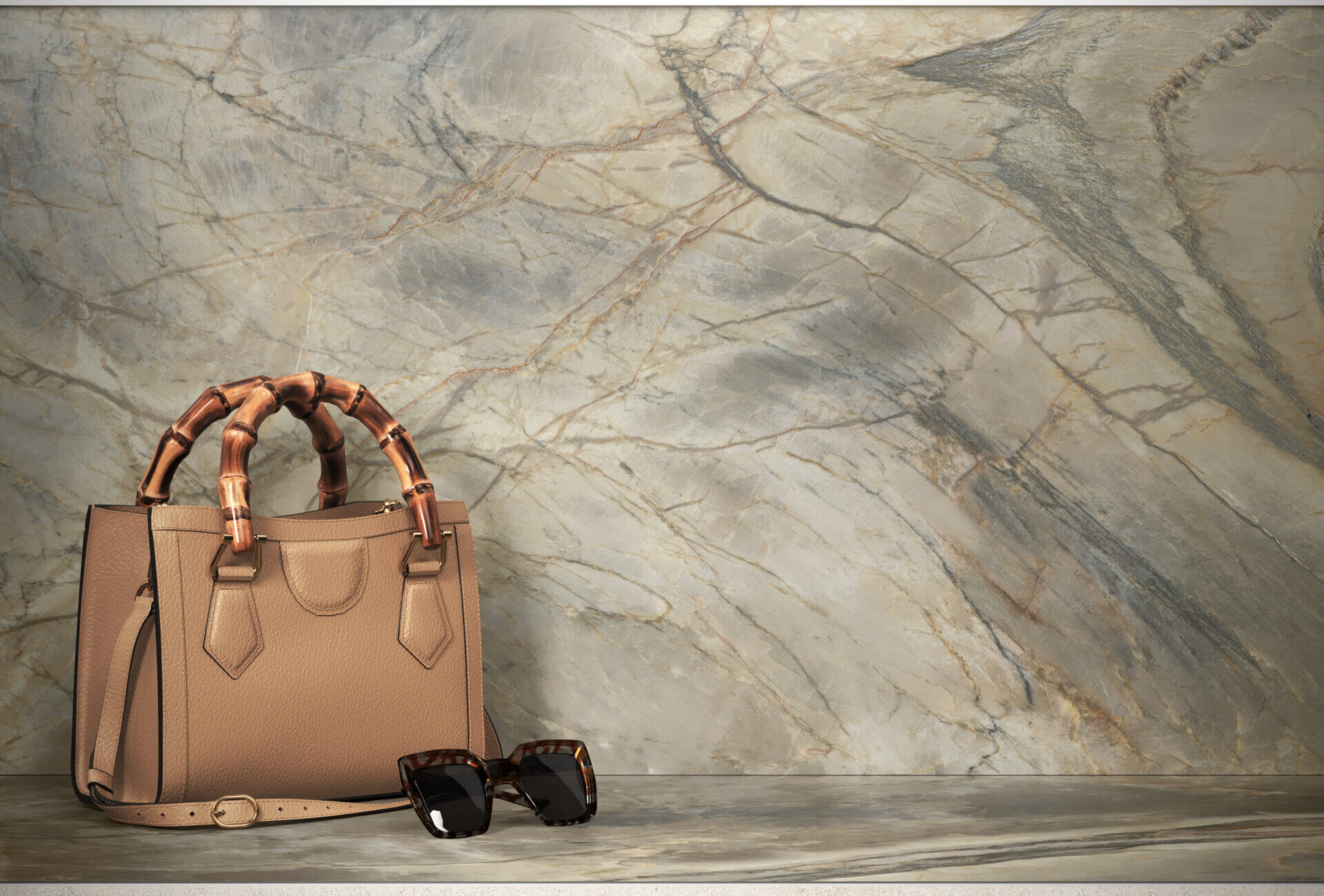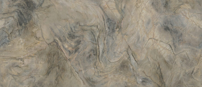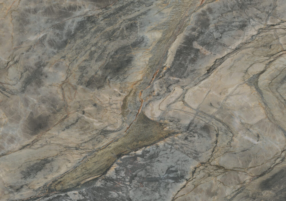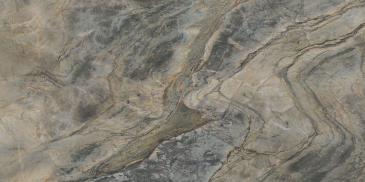 Derived from a beautiful Brazilian stone, its distinctive features lie in its polychromatic palette, where the bold blue-black veins run like contours, cleaving the swirling surface, in which ferrous streaks bring a welcoming warmth.